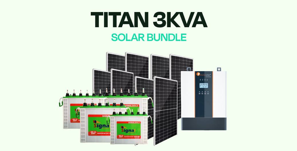 The Titan 3KVA Solar Bundle is a rugged off-grid solution with a 3KVA hybrid inverter, four 220Ah tubular batteries, and eight 500W solar panels, delivering reliable all-day power for homes and small businesses.